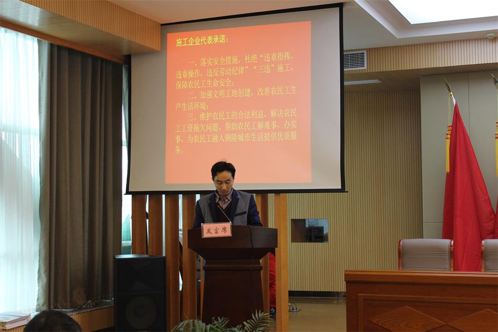 關(guān)愛農(nóng)民工源于內(nèi)心、貴在堅持?;顒蝇F(xiàn)場,安徽國泰建筑有限公司杜軍云代表作出了關(guān)愛農(nóng)民工的莊嚴(yán)承諾,農(nóng)民工代表承諾將立足本職工作,苦練技能,為建設(shè)銅陵文明之城增光添彩。