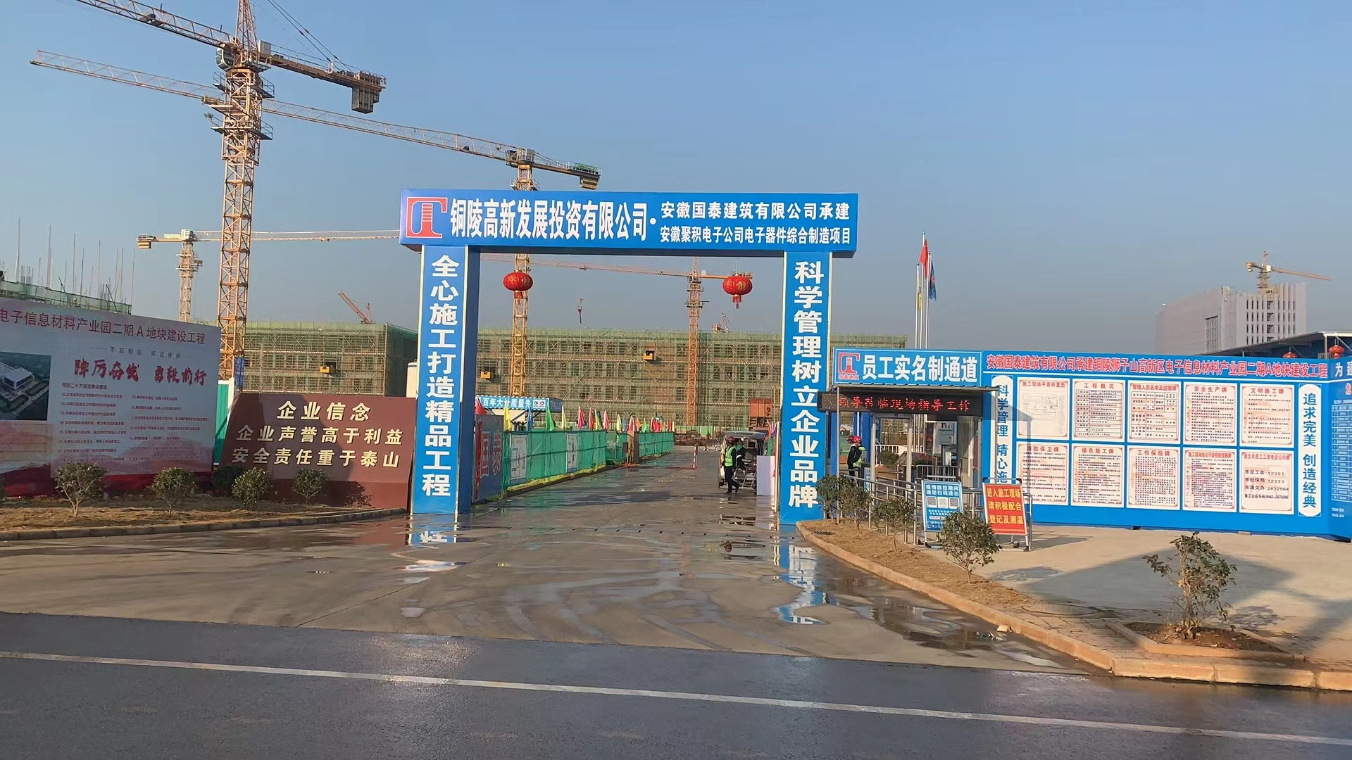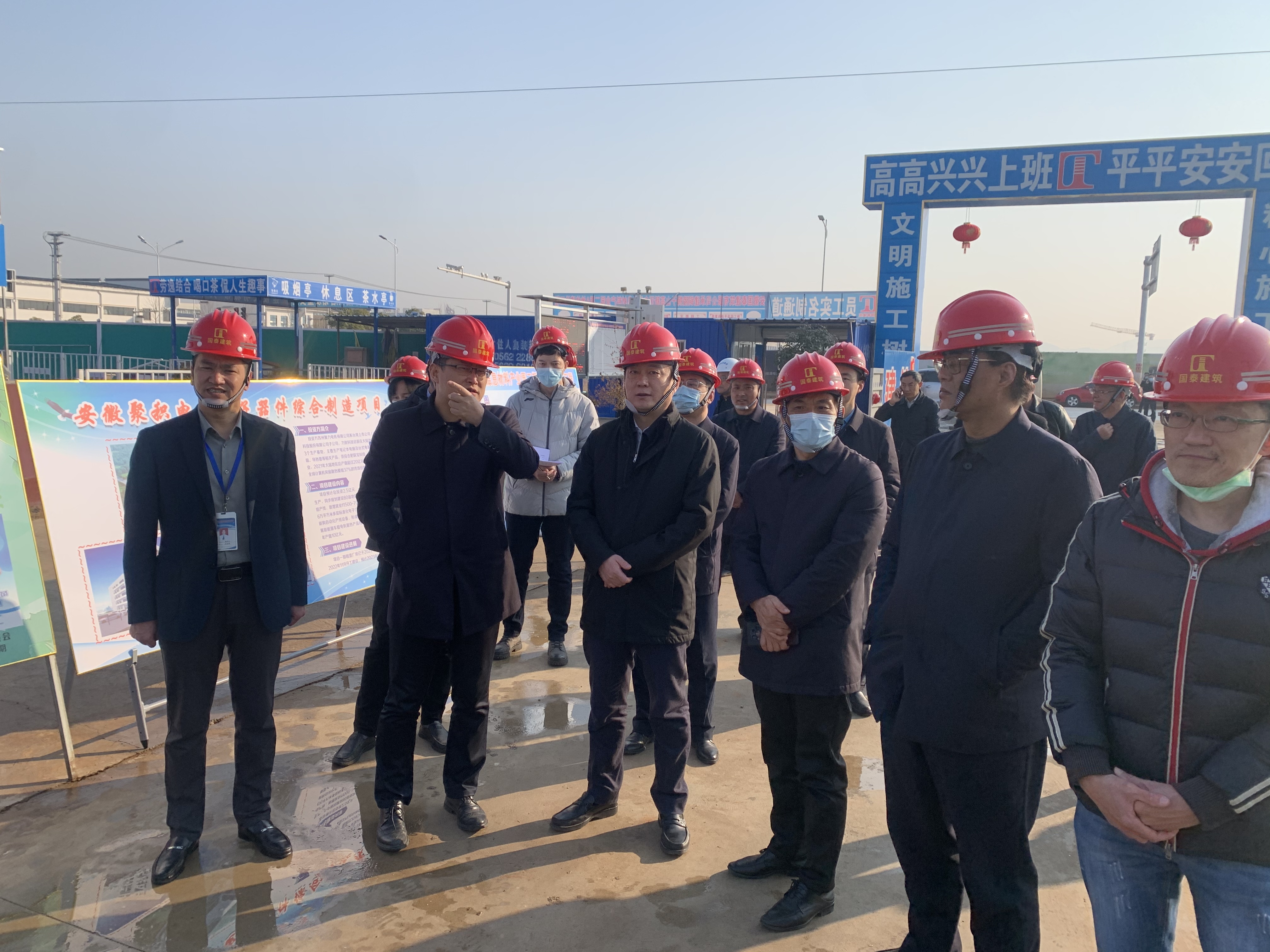 春節(jié)以來,國泰建筑各施工項目陸續(xù)開工復工。2023年2月1日下午,銅陵市市委副書記、市長孔濤等各單位領導到訪我司承建的獅子山高新區(qū)電子信息材料產(chǎn)業(yè)園二期A地塊建設工程項目現(xiàn)場視察復工情況。公司總經(jīng)理張四兵陪同考察。