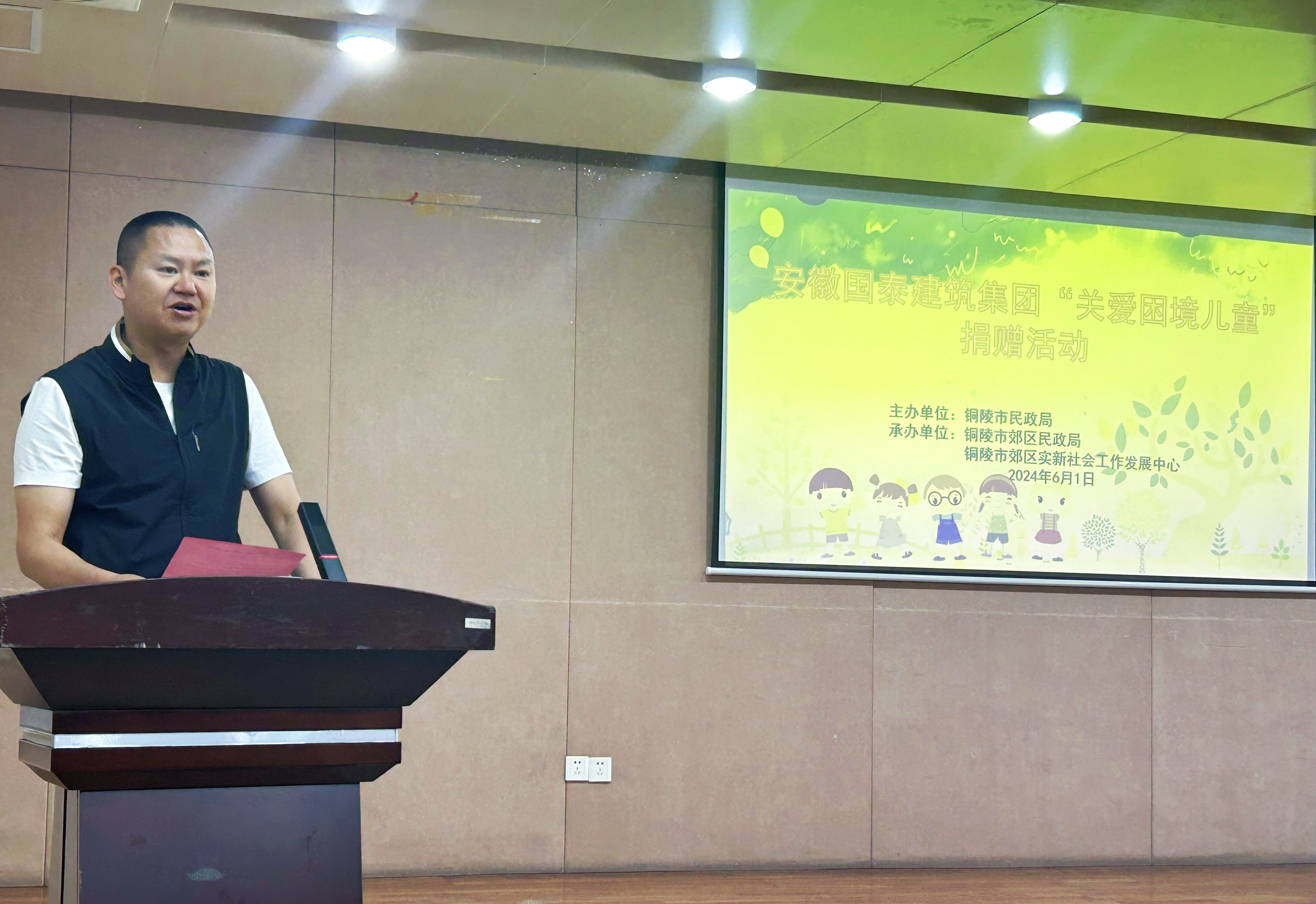 6月1日上午九時(shí)許,“潤(rùn)心伴成長(zhǎng)、同心護(hù)未來(lái)”公益捐贈(zèng)活動(dòng)在郊區(qū)政府會(huì)議廳舉行。郊區(qū)政府副區(qū)長(zhǎng)李瑤、市福利中心主任巫曉明、各縣區(qū)民政局等領(lǐng)導(dǎo)及受助監(jiān)護(hù)人代表出席。活動(dòng)由郊區(qū)民政局局長(zhǎng)余軼華主持。國(guó)泰建筑董事長(zhǎng)張自州參加捐贈(zèng)儀式并致辭。