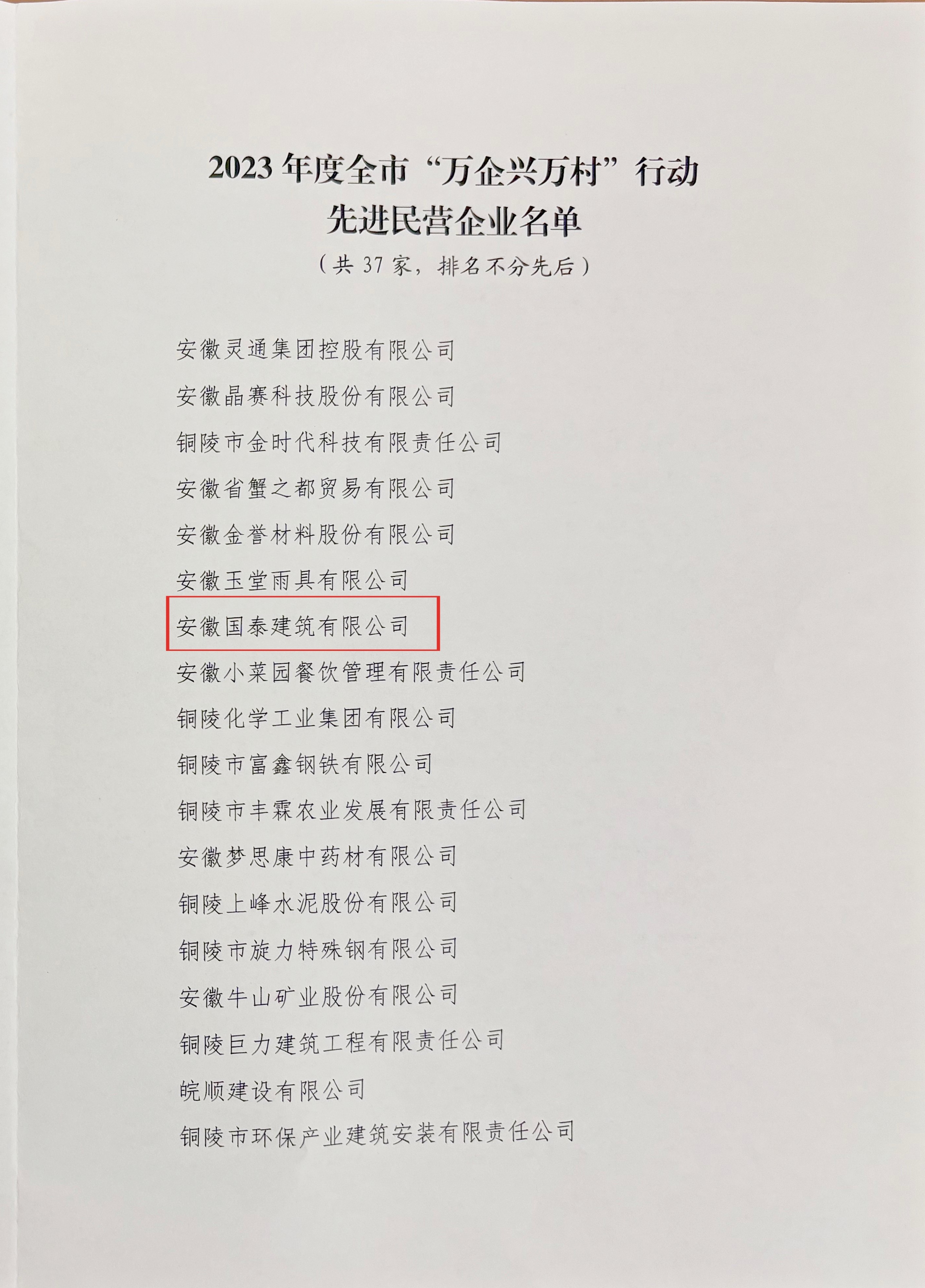 會(huì)議上書面?zhèn)鬟_(dá)了學(xué)習(xí)習(xí)近平總書記在2023年全國(guó)“兩會(huì)”有關(guān)“萬企興萬村”行動(dòng)的重要論述和安徽省“萬企興萬村”行動(dòng)推進(jìn)會(huì)精神。同時(shí)通報(bào)表?yè)P(yáng)了2023年度全市“萬企興萬村”行動(dòng)先進(jìn)民營(yíng)企業(yè)。其中國(guó)泰建筑榮獲該項(xiàng)殊榮。公司黨支部副書記張世忠在會(huì)中發(fā)表獲獎(jiǎng)感言,感謝市委市政府和相關(guān)單位對(duì)公司助力鄉(xiāng)村振興工作的肯定。公司將會(huì)持續(xù)積極地為推進(jìn)鄉(xiāng)村建設(shè)貢獻(xiàn)力量。